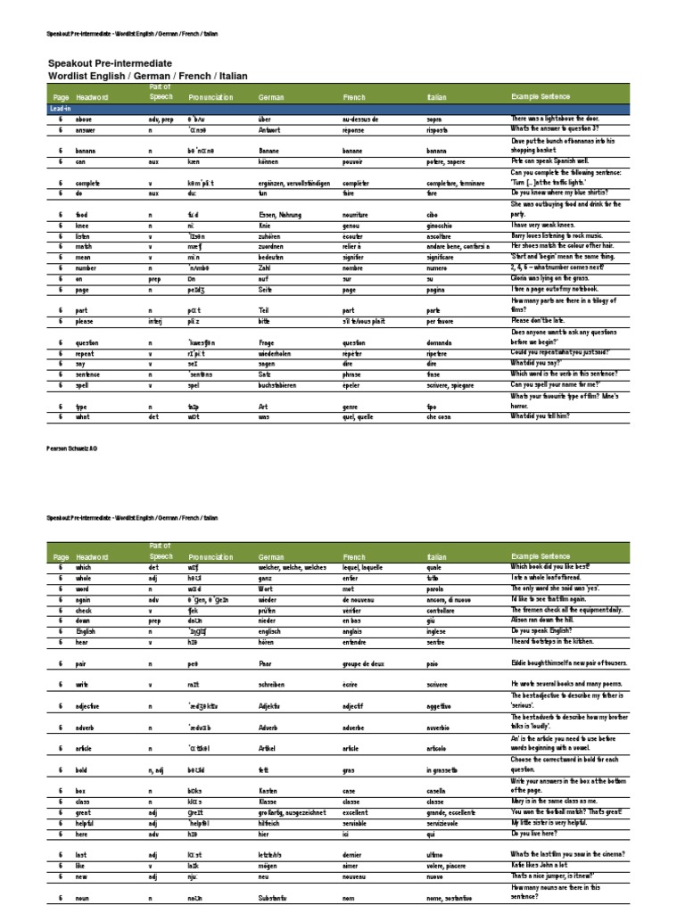 Speakout Pre Intermediate Wordlist English German French Italian Syntax